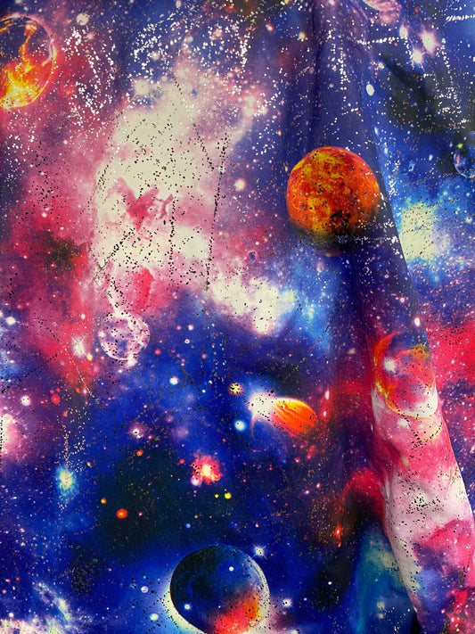 Galaxy design on nylon spandex with foil all over 58/60” 4way stretch Sold by the yd ships worldwide from Los Angeles California USA.