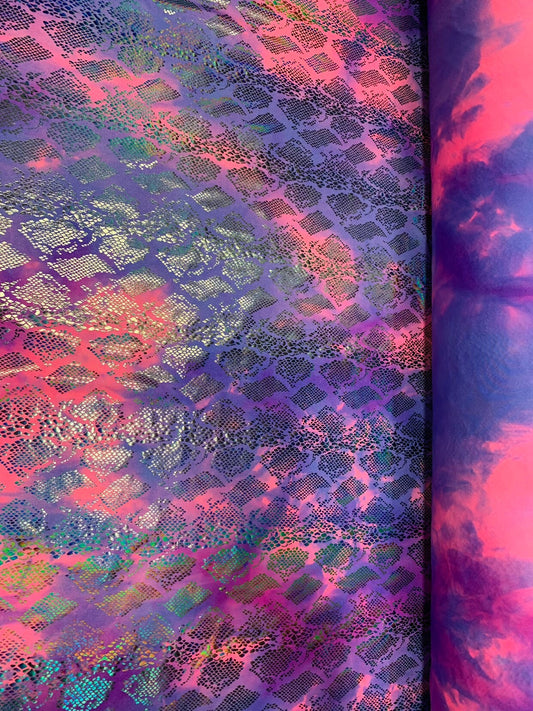 Snake skin tie dye with red Hologram foil nylon spandex 4way Stretch 58/60" Sold by the YD. Ships worldwide from Los Angeles California USA