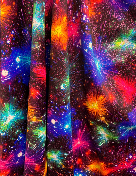 New fireworks design multicolor print on nylon spandex 4way stretch 58/60" Sold by the YD. Ships worldwide from Los Angeles California USA.