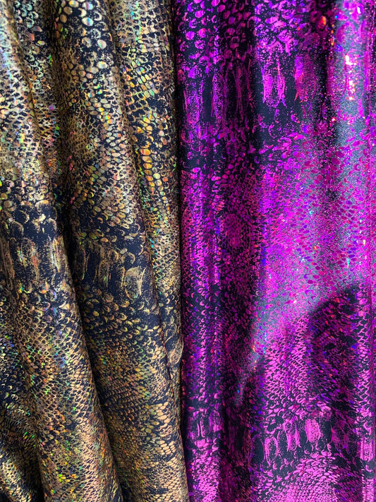 New Bull snake design nylon spandex with iridescent snake foil 4way stretch 58/60" Sold by the YD. Ships worldwide from Los Angeles CA USA.