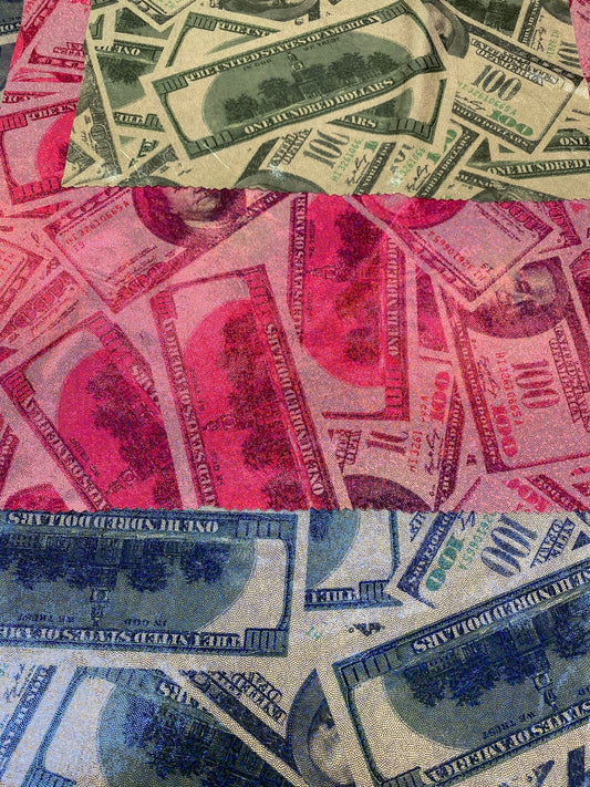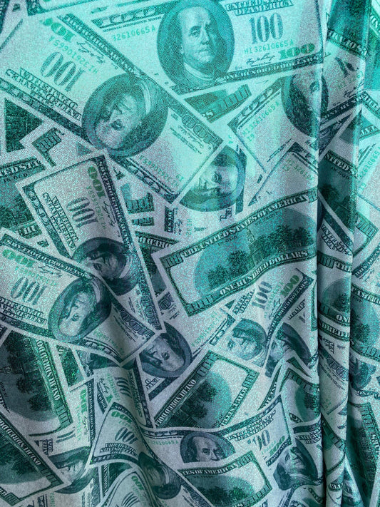 Money print design metallic hologram nylon spandex 4-way stretch 58/60” Sold by the YD. Ships Worldwide from Los Angeles California USA.