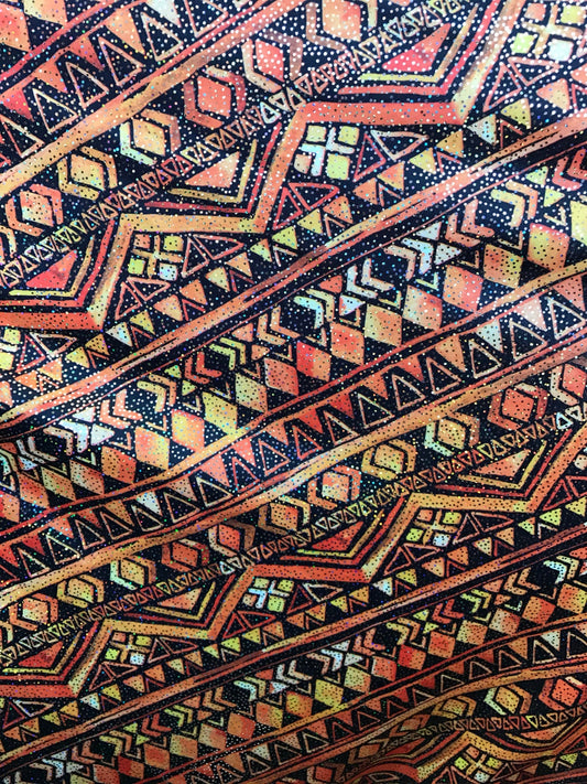 Nylon spandex AZTEC design 4way Stretch with foggy foil 58/60" Sold by the yd Ships worldwide from Los Angeles California USA.
