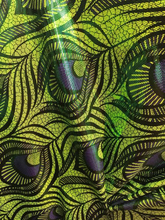 Peacock desin metallic print on nylon spandex 4way stretch 58/60" Sils by the YD. Ships worldwide from Los Angeles California USA