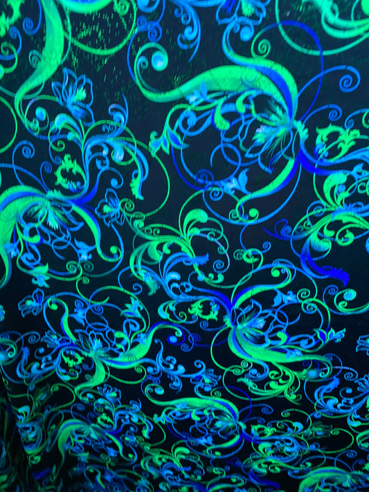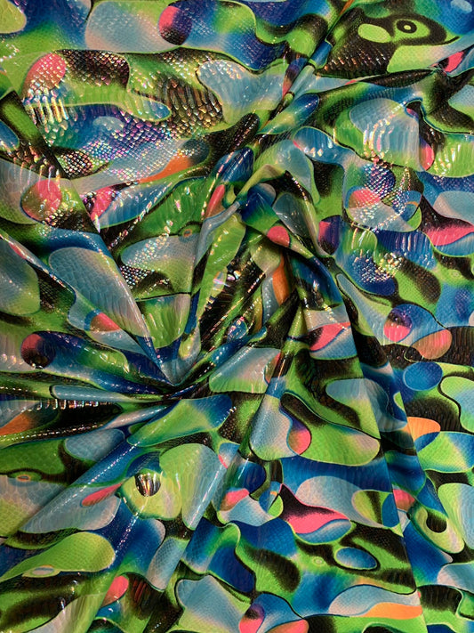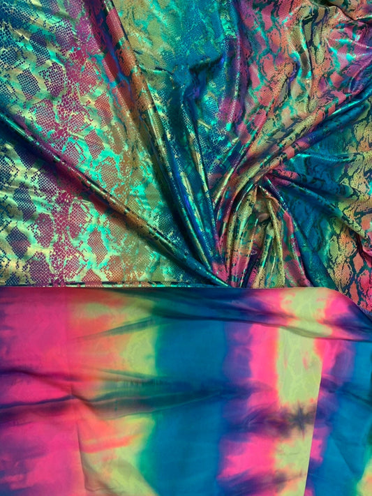 King snake design tie dye metallic nylon spandex with iridescent foil 4way 58/60" Sold by the YD. Ships worldwide from Los Angeles CA USA.