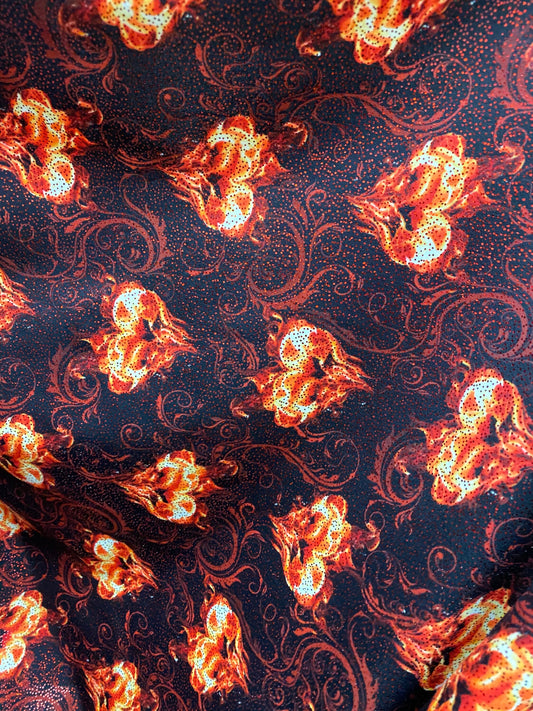 Fire Hot Desire design print nylon spandex with metallic foil all over 4-way stretch 58/60” Sold by the YD. Ships worldwide from L.A CA USA