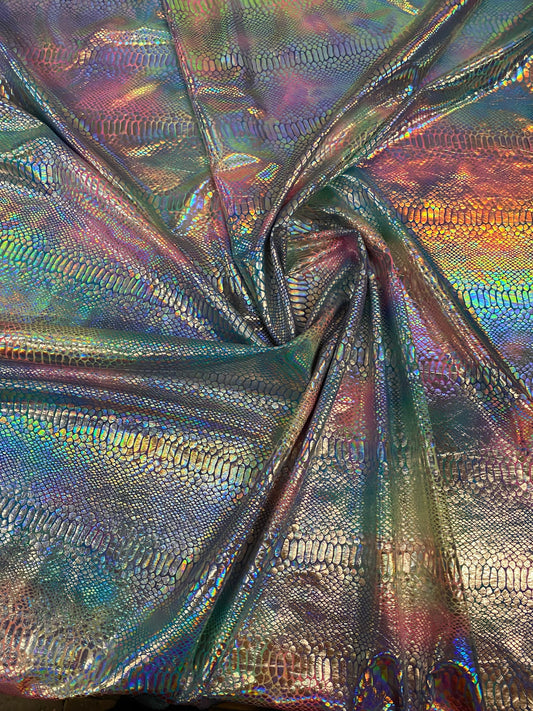 Unicorn reptile hologram metallic skin snake tie dye rainbow base 4way nylon spandex 58/60" Sold by the YD. Ships worldwide from Los Angeles