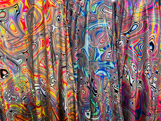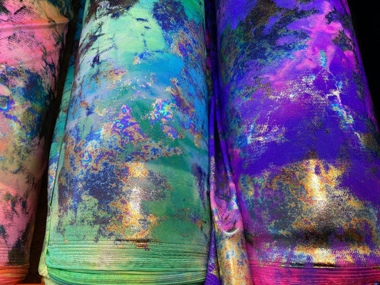 Tie dye splash design metallic iridescent nylon spandex 4way stretch 58/60" Sold by the YD. Ships worldwide from Los Angeles California USA.