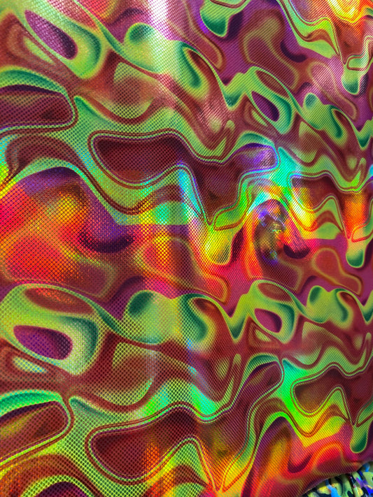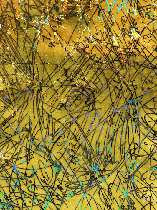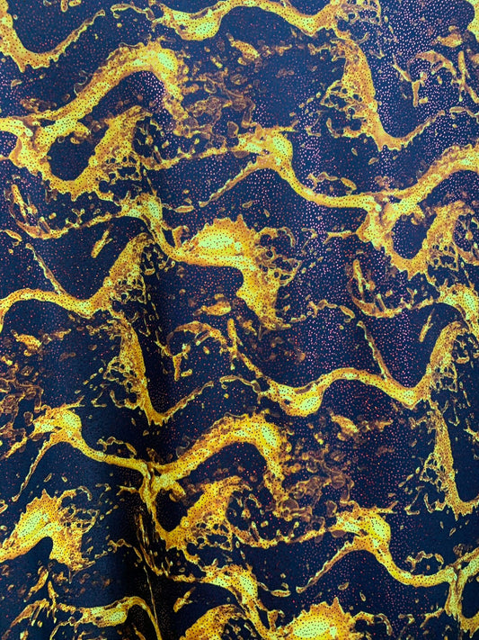 New modern lava design digital foil print lacer hologram metallic nylon spandex 4-way stretch 58/60” Sold by the YD. Ships worldwide from LA