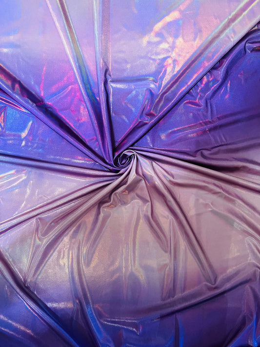New Ombré design all over foil two tone hologram foil 4way stretch 58/60” Sold by the YD. Ships worldwide from Los Angeles CA USA.