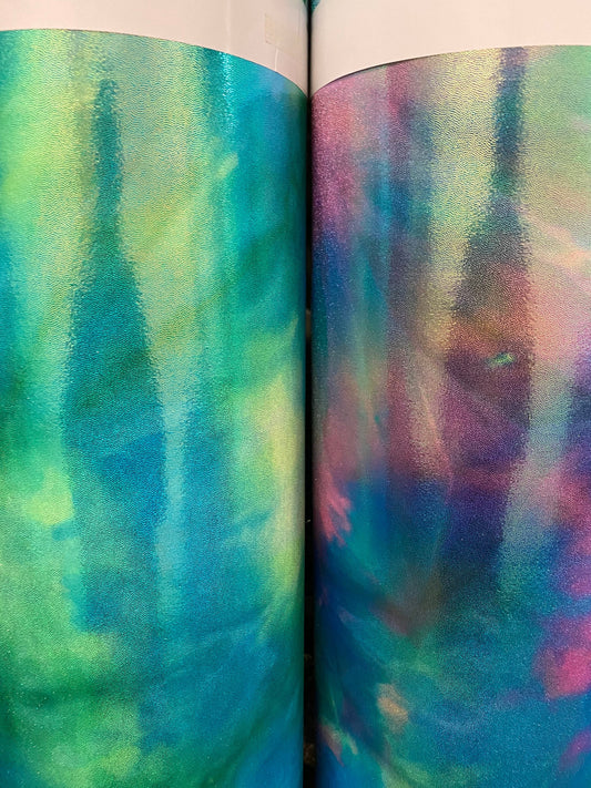 New tie dye foggy foil metallic nylon spandex 4-way stretch 58/60” Sold by the YD. Ships worldwide from Los Angeles California