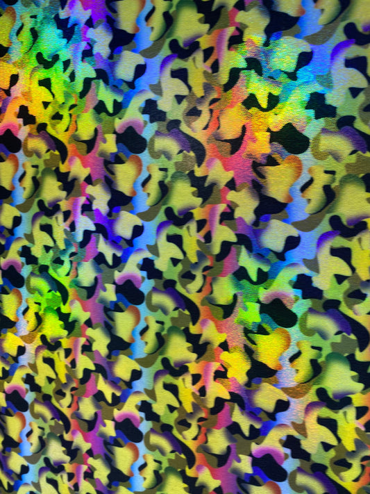 Exotic hologram leopard design print on nylon spandex 4-way stretch 58/60” Sold by the YD. Ships Worldwide from Los Angeles California USA.