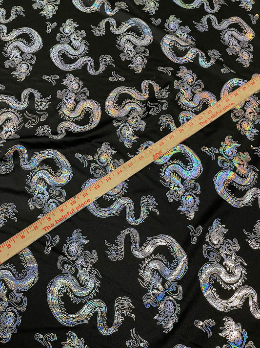 New Dragon design print on metallic nylon spandex 4-way stretch 58/60” Sold by the YD. Ships worldwide from Los Ángeles California USA.