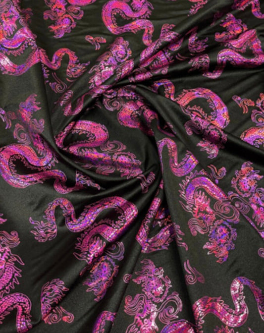 New Dragon design print on metallic nylon spandex Black Iridescent fuchsia 4-way stretch spandex 58/60” Sold by the YD. Ships worldwide