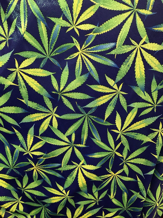 Marijuana design nylon spandex with foggy foil all over 4 way stretch 58/60" sold by the yd. ships worldwide from Los Angeles California USA