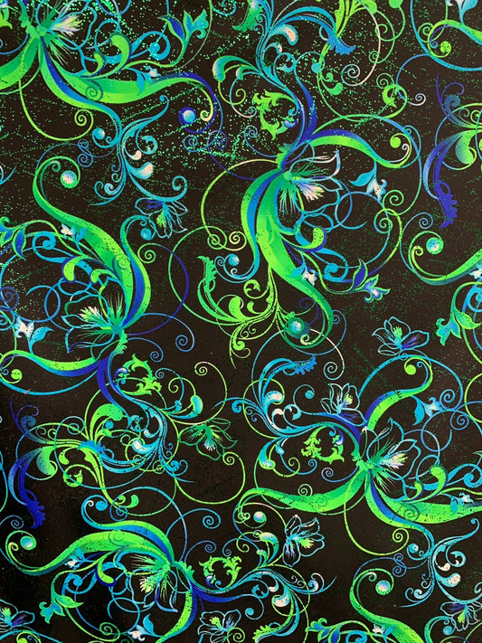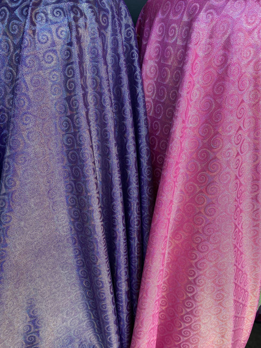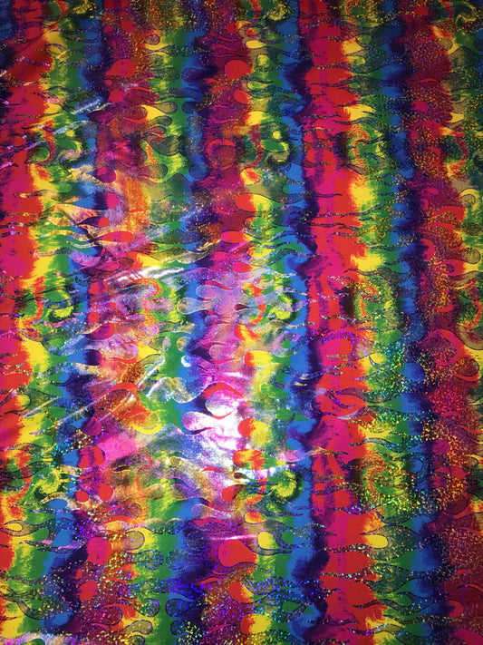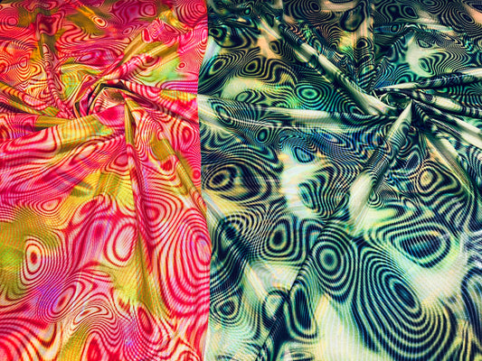 New swirl design hologram metallic nylon spandex 4-way stretch 48/50” Sold by the YD. Ships worldwide from Los Angeles California USA.