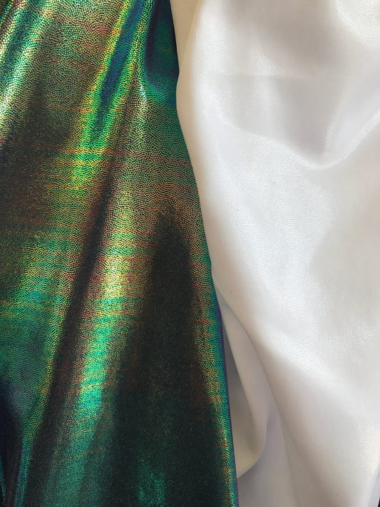 Foggy foil iridescent green & white clear metallic nylon spandex 4way 58/60" Sold by the YD. Ships worldwide from Los Angeles CA