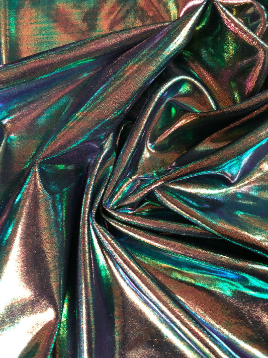 New Iridescent foggy foil oil effect metallic nylon spandex 4way stretch Sold by the YD. Ships worldwide from Los Angeles California USA