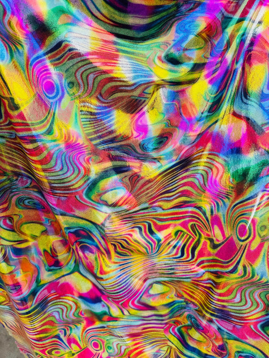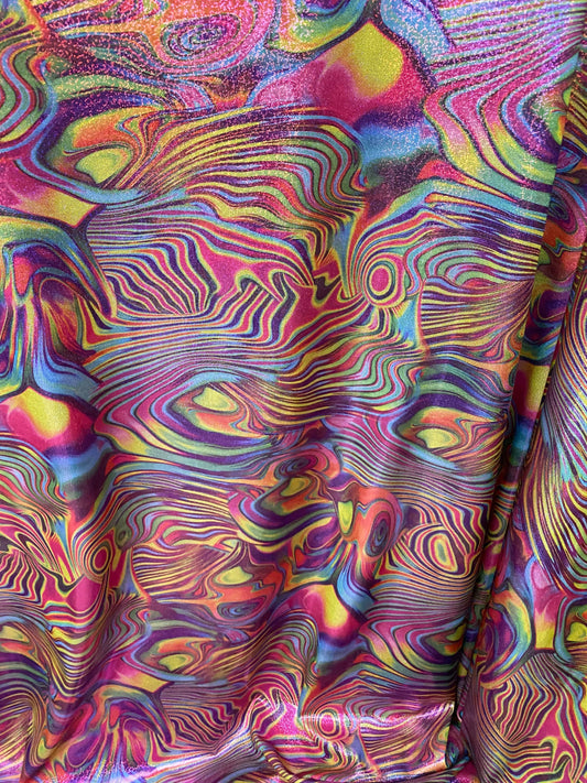 New abstract lava design with foil multicolor print on nylon spandex 4way stretch 58/60” Sold by the YD. Ships worldwide from Los Angeles CA