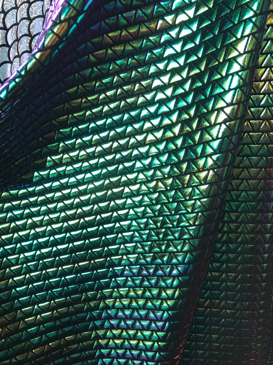 NEW Iridescent green triangle design metallic spandex 4way Stretch 58/60" Sold by the YD. Ships worldwide from Los Angeles California USA.