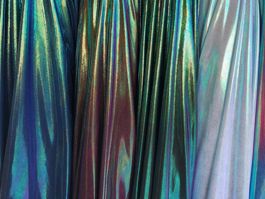 New iridescent foggy foil on nylon spandex 4way stretch 58/60" Sold by the YD. Ships worldwide from Los Angeles California USA