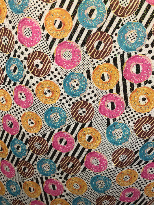 New nylon spandex print with foil all over yum yum donuts design 58/60" Sold by ghe YD. Ships worldwide from Los Angeles California USA.