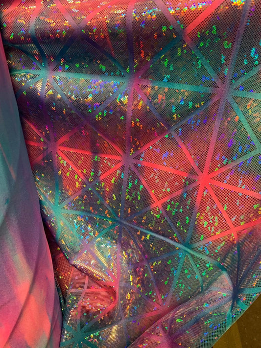 NEW Unicorn tie dye rainbow and cotton candy colors hologram shatter glass/multicolor iridescent foil-Triangles shapes nylon spandex 4way.