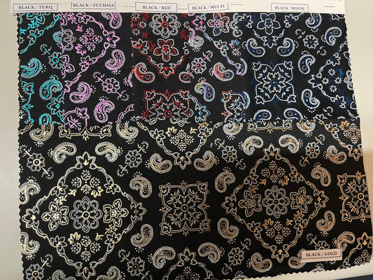 Luxury Bandana Paisley design metallic hologram nylon spandex 4-way stretch 58/60” Sold by the YD. Ships Worldwide from Los Angeles CA USA.