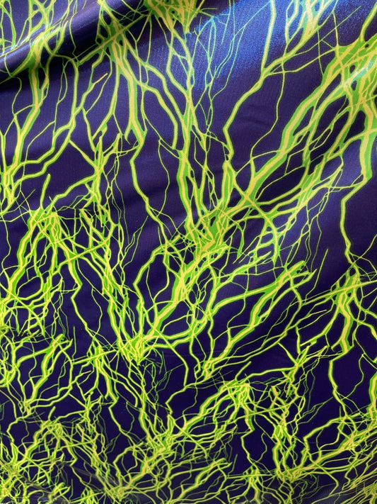 New Lightning bolt design Sapphire/green metallic nylon spandex 4-way stretch 58/60” Sold by the YD. Ships worldwide from Los Angeles cali