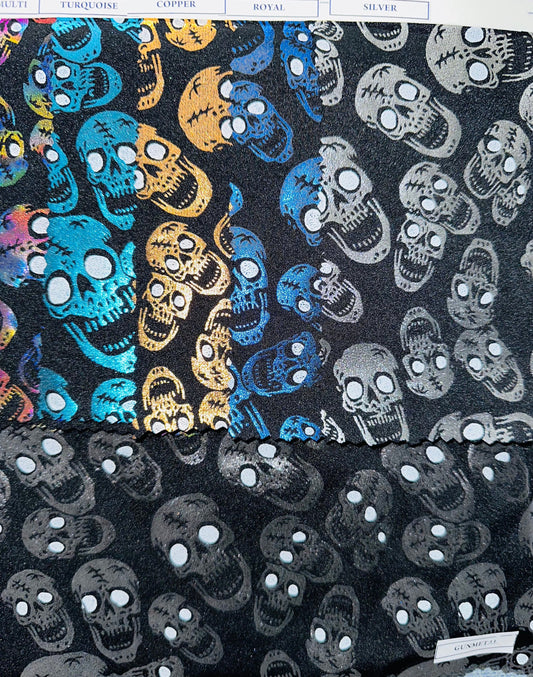 Luxury Laughing skulls design metallic nylon spandex with foil 4-way stretch 58/60” Sold by the YD. Ships worldwide from L.A