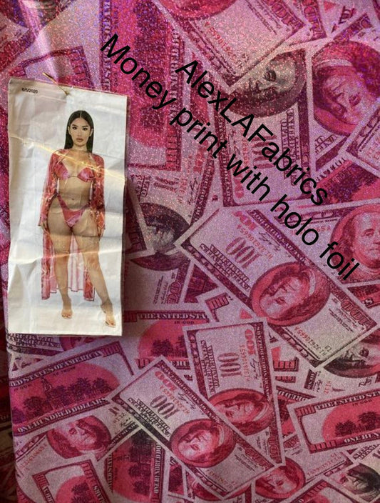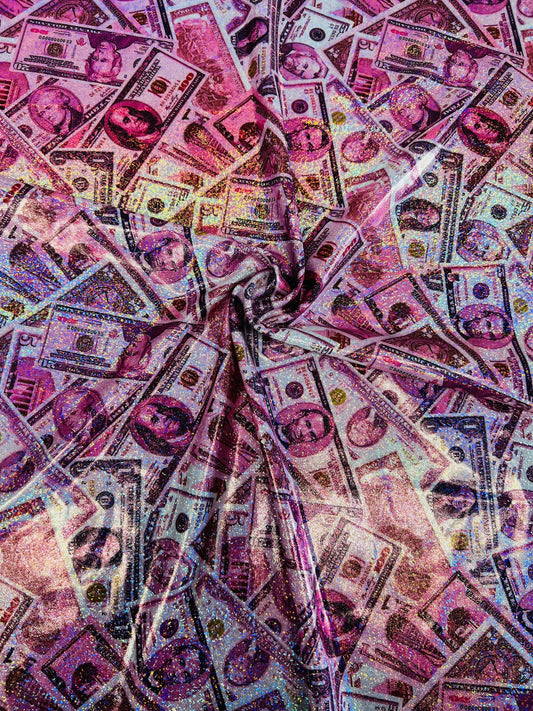New Money design 100 dollar bill hologram pink/green with foil and without foil print on 4-way nylon spandex 58/60” Sold by the YD.