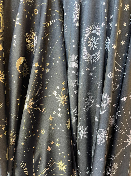 New celestial multi stars design on best metallic Nylon spandex 4-way stretch 58/60” Sold by the YD. Ships Worldwide from Los Angeles cali