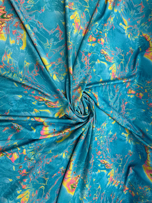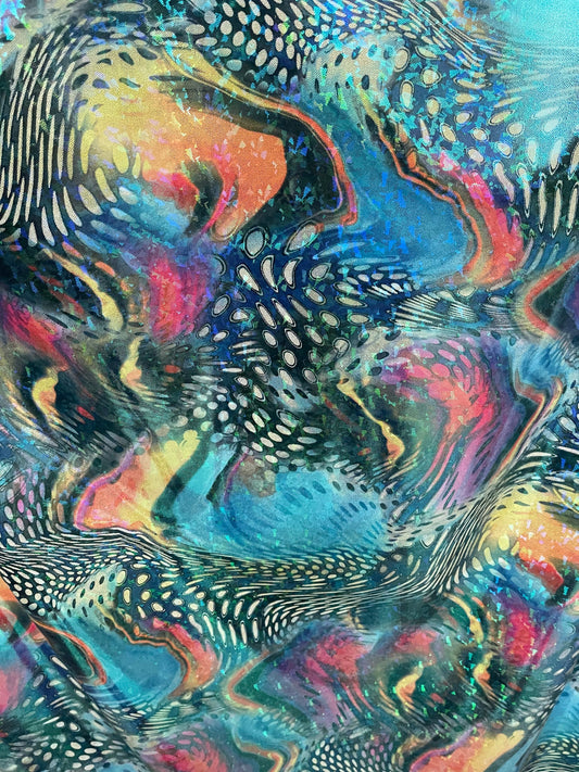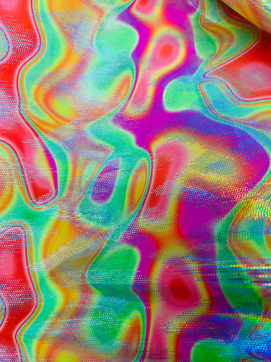 New lava abstract digital design hologram metallic nylon spandex 4-way stretch 58/60” Sold by the YD. Ships Worldwide from Los Angeles CA
