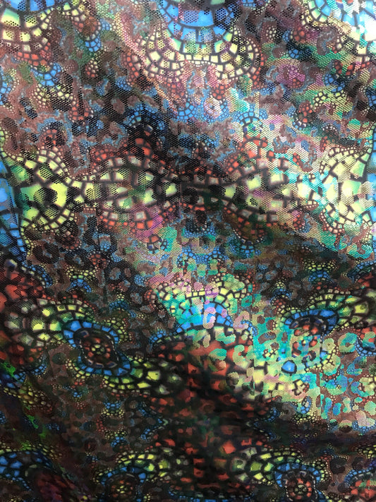Safari design multi animal print on best quality of nylon spandex with hologram shattered glass metallic foil 4-way stretch 58/60”