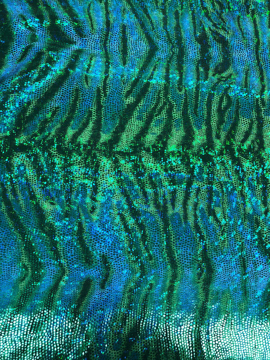 New animal print iridescent foil all over Hologram nylon spandex 4way stretch 58/60" Sold by the YD. Ships worldwide from Los Angeles CA