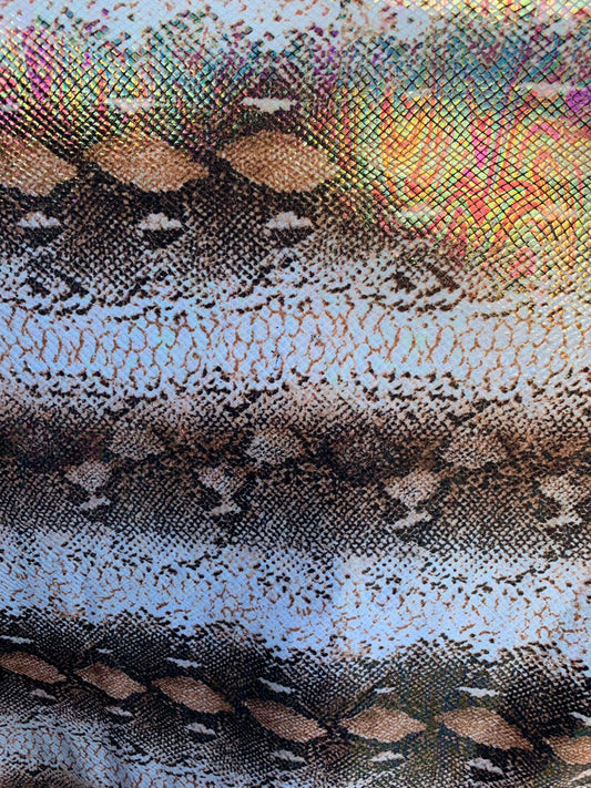 New Iridescent snake design with iridescent clear foil natural color spandex 4way 58/60" Sold by the YD. Ships worldwide from Los Angeles CA