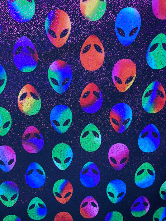 Mars Alien design Uv light it glows in the dark with black light best quality of nylon spandex with foggy foil 4-way stretch 58/60”