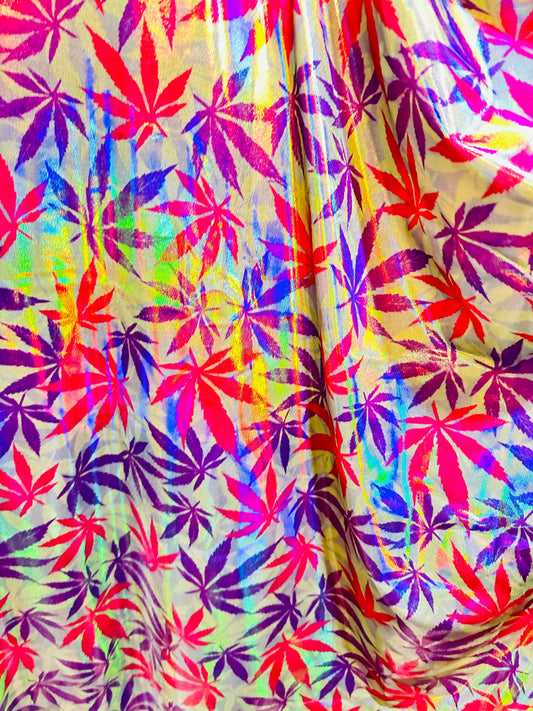 New Marihuana leaf design on Iridescent metallic nylon spandex with foggy foil 4-way stretch 58/60”