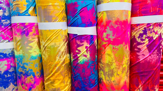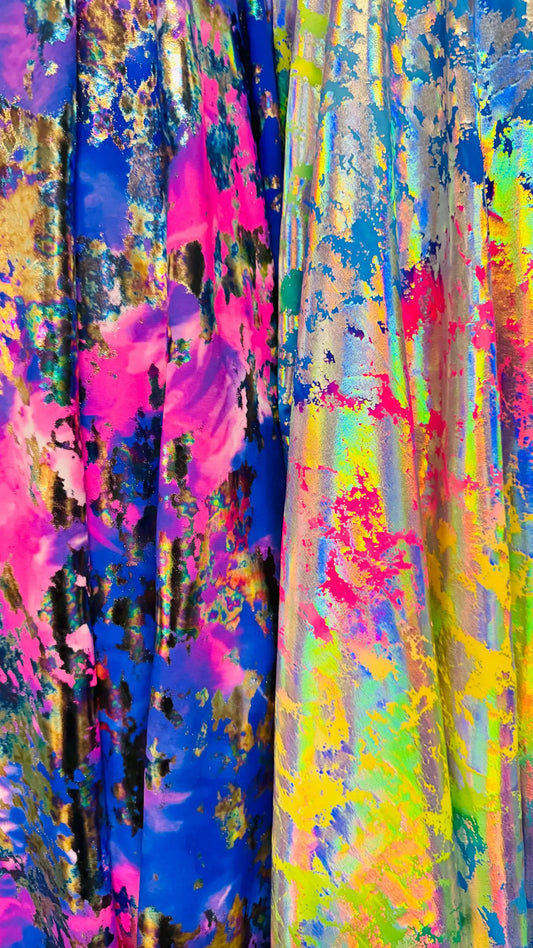 New abstract design tie dye metallic nylon spandex 4-way stretch 59/60” Sold by the YD.