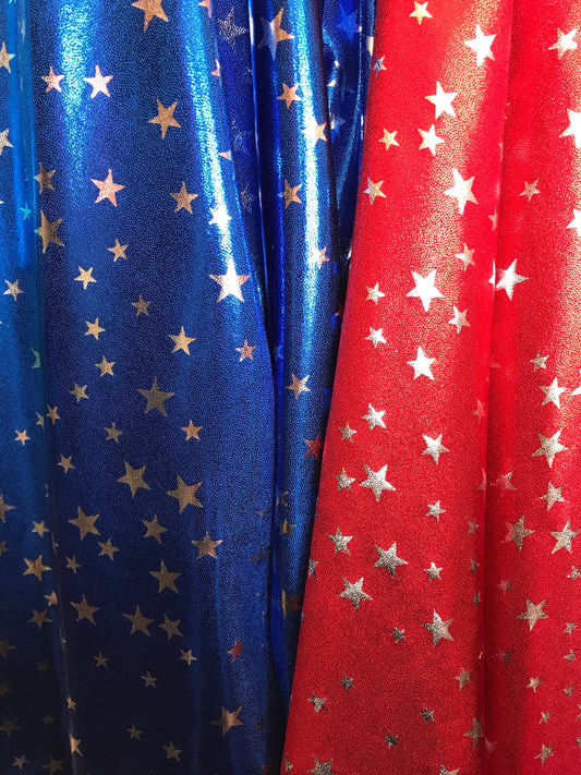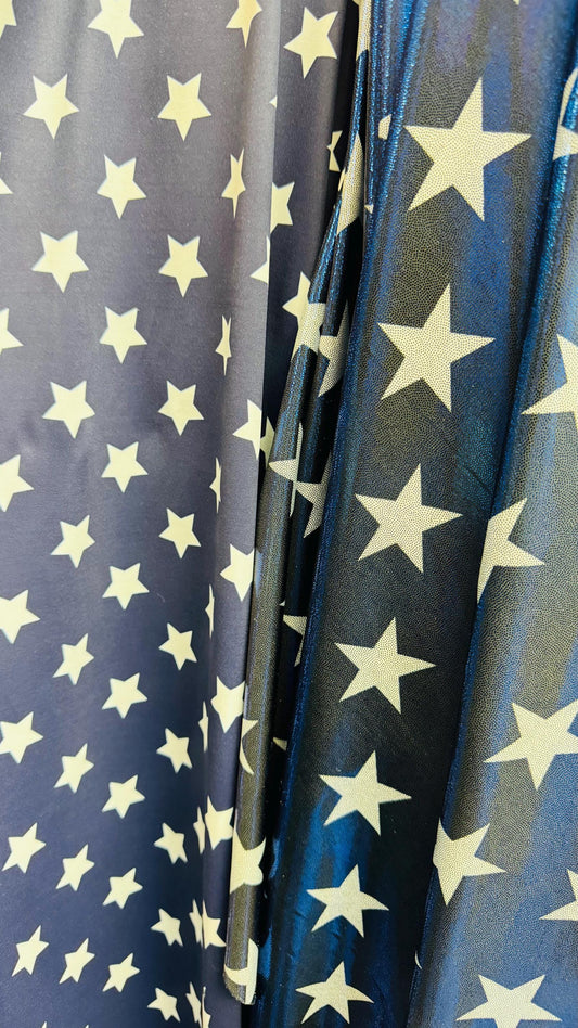 New Stars design print on nylon spandex with foggy foil all over 4way 58/60" Sold by the YD. Ships worldwide from Los Angeles CA USA