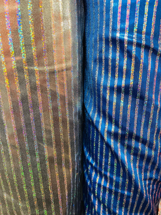New striped metallic foggy foil hologram metallic nylon spandex 4-way stretch 58/60” Sold by the YD. Ships Worldwide from Los Angeles CA