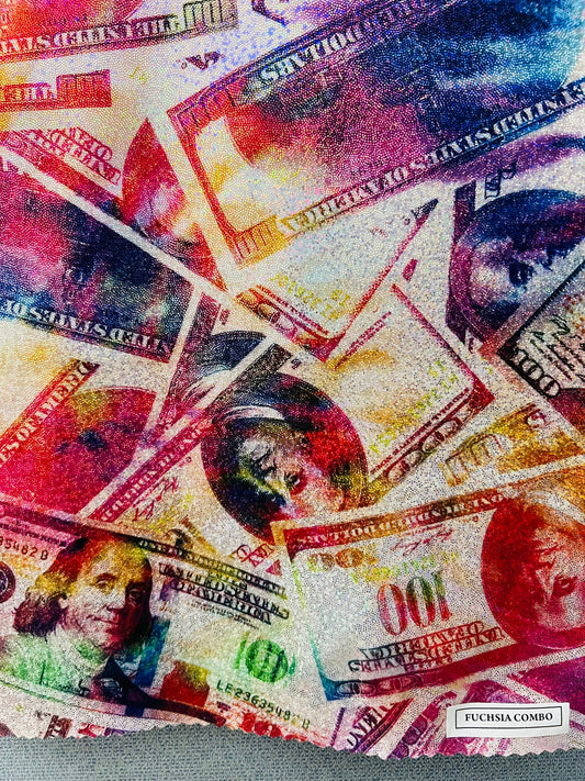 New Money 100 Dollar Bill design hologram tie dye metallic Nylon spandex digital print 4-way stretch 58/60” Sold by the YD. Ships worldwide