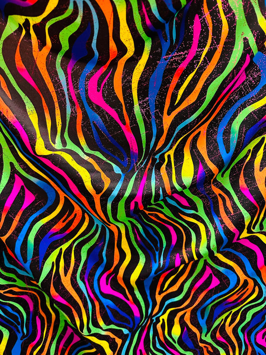 Rainbow zebra design print on nylon spandex with foil and without foil 4way stretch 58/60” Sold by the YD. Ships worldwide from Los Angeles