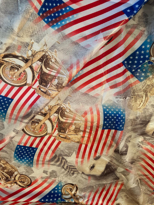 American flag design heavy metallic nylon spandex 4way stretch 58/60" Sold by the YD. Ships worldwide from Los Angeles California USA.