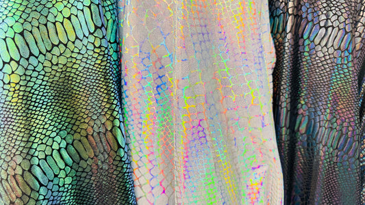 New snake Metallic nylon spandex iridescent Hologram foil 4way Stretch 58/60" Sold by the YD. Ships Worldwide from Los Angeles California US