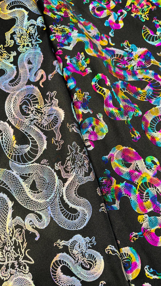 New 3D Dragon design Iridescent metallic nylon spandex 4-way stretch 58/60” Sold by the YD. Ships worldwide from Los Ángeles California USA.