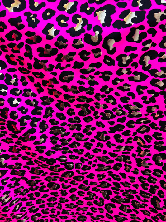 Metallic Exotic leopard design Pink/Gold it glows in the dark with black light best quality of nylon spandex 4-way stretch 58/60”