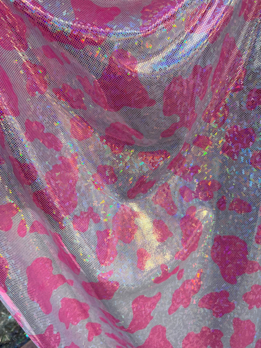 Cow design w/silver/pink on shattered glass New metallic hologram nylon spandex 4-way stretch 58/60” Sold by the YD. Ships worldwide