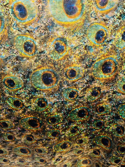 Exotic Peacock design on shattered glass hologram metallic nylon spandex 4-way stretch
