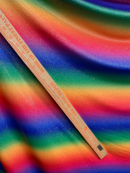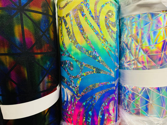 New rainbow heavy nylon spandex with foggy foil all over 4way stretch 58/60" Sold by the YD. Ships worldwide from Los Angeles California USA