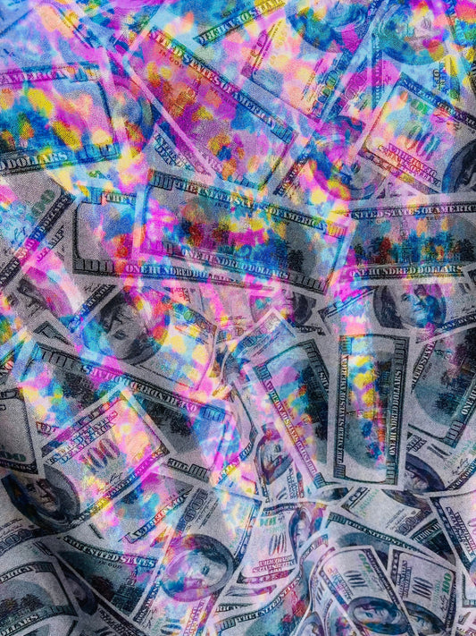 Luxury Money design Iridescent hologram nylon spandex 4-way stretch 58/60” Sold by the YD. Ships Worldwide from Los Angeles California USA.